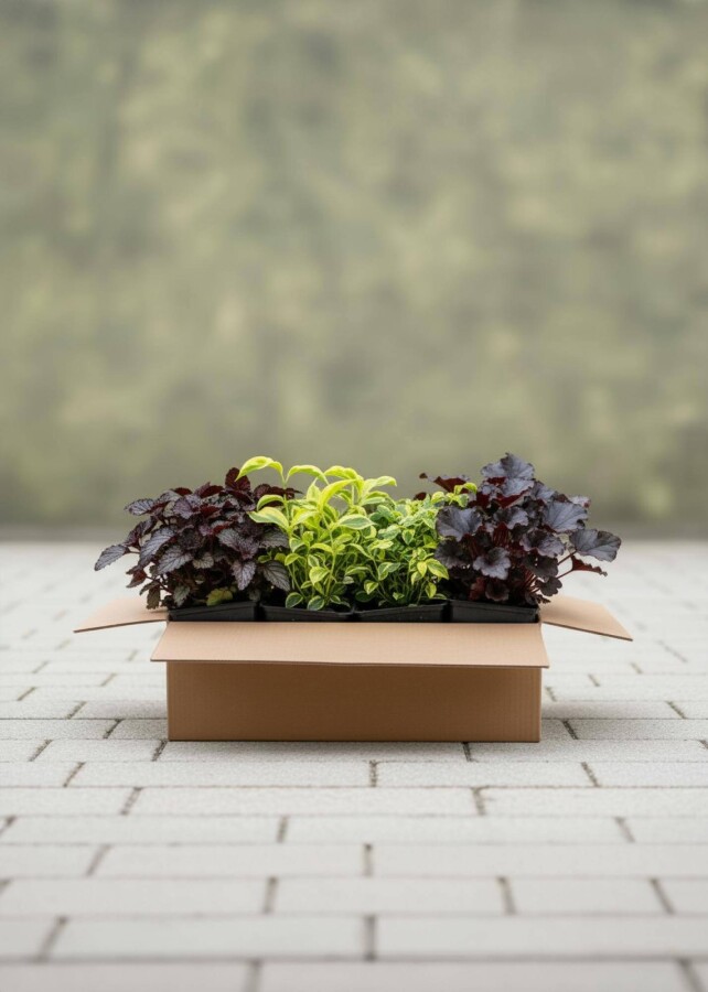 Vi leverer små eller mellemstore planter i kasser. Kassens størrelse afhænger af plantens størrelse. Vi sørger altid for, at planten har plads nok, men stadig står godt fast i kassen, så den ikke bliver beskadiget under transporten.