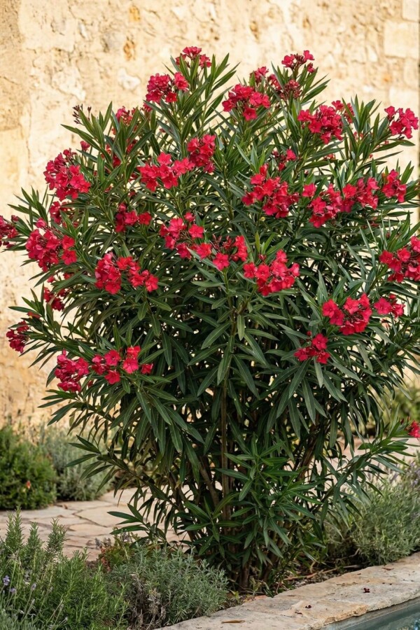 • Nerium oleander blomstrer rigt med røde, lyserøde og hvide blomster fra juni til september, hvilket giver en lang sæson med visuel interesse.
