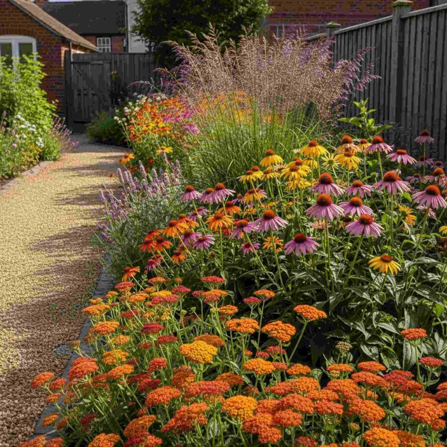 • Afbalanceret mix af blomstrende stauder og prydgræs for struktur