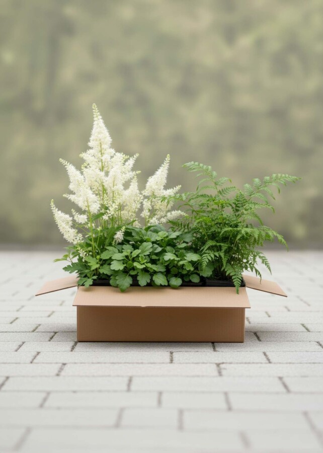 Vi leverer små eller mellemstore planter i kasser. Kassens størrelse afhænger af plantens størrelse. Vi sørger altid for, at planten har plads nok, men stadig står godt fast i kassen, så den ikke bliver beskadiget under transporten.