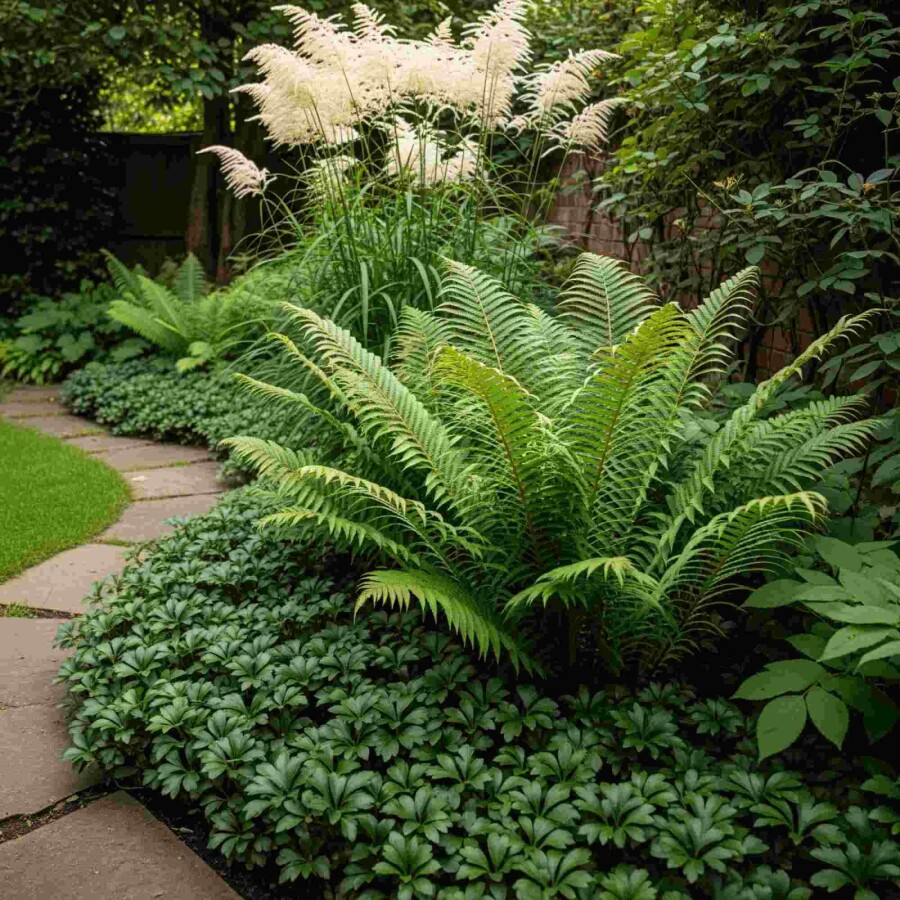 • Harmonisk kombination af blomsterhøjde, stedsegrøn “tæppeeffekt” og fine bregnestrukturer